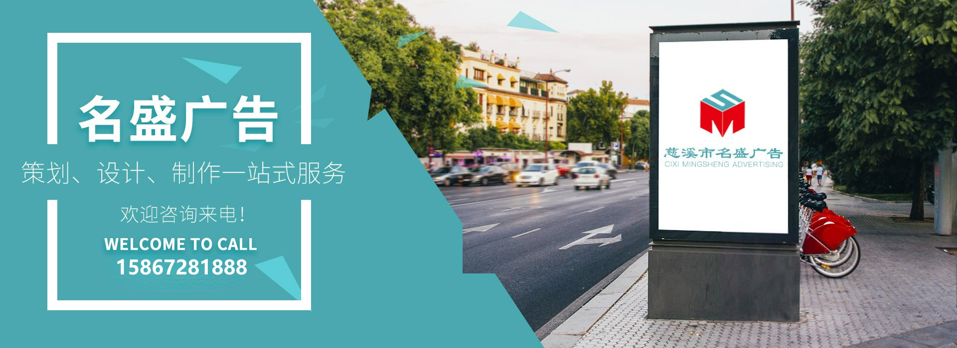 慈溪广告公司-慈溪市名盛广告制作中心位于浙江慈溪市逍林镇林西村,始创于1998年,是一家集设计、制作、庆典、发布为一体的专业型单位,以“优质的服务”竭诚为您服务!其中主营《平面设计》、《样本设计》、《写真喷绘》、《展架制作》、《标牌工程》、《广告字》、《庆典礼仪》、《户内外广告牌工程》、《墙体广告制作,政府标语彩绘--墙体广告绘画制作由金牌美工(阿朗领衔制作)》、《专业电子屏,LED光亮工程制作施工》、《的士、企事业商务、车身广告》等。另外还包括POP手工墙体艺术彩绘、户外大中型广告牌、字牌、发光字、电子屏、墙体广告、政府彩绘标语、喷绘、写真、横幅、样品样本、商标标签、单页名片、印刷制作、企业影视宣传片等业务为您提供策划、设计、制作一站式服务。“成功有方法,失败有原因;不要为失败找理由”!公司秉承“守信誉第一,重质量,价格优”的经营理念,坚持“我们的制作,会使您的电话线发烫!”的原则为广大客户提供优质的服务。欢迎您来电咨询,联系手机可快速回应。